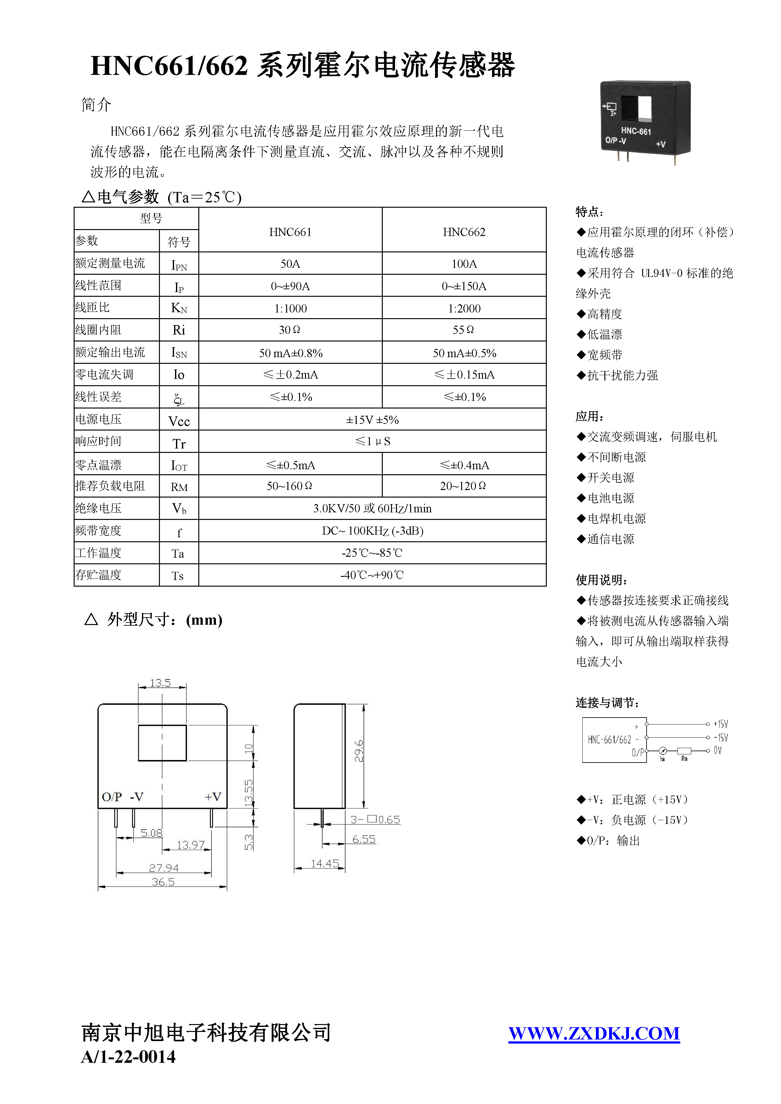 HNC-661 series Hall current sensor is a new generation of current sensor using the principle of Hall effect. It can measure currents of DC, AC, pulse and various irregular waveform under electrical isolation.