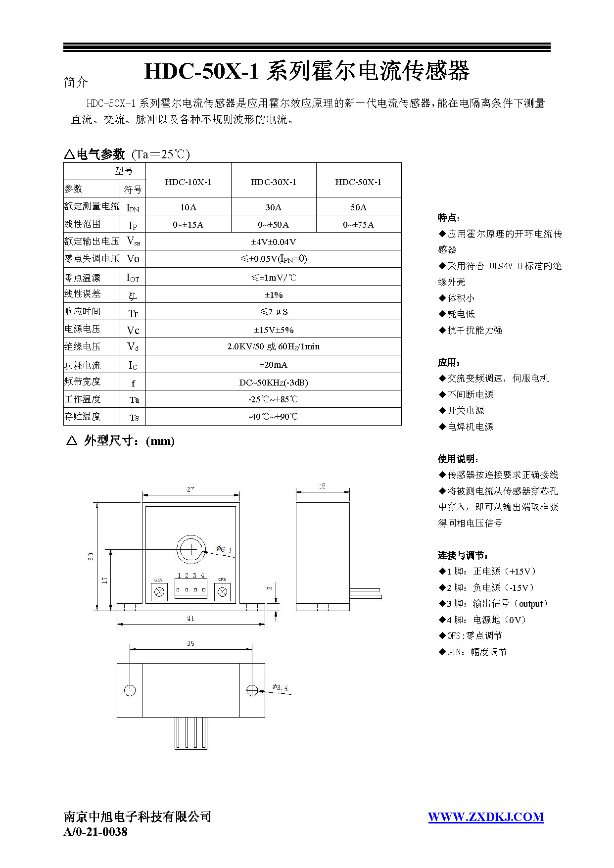 HDC-50X series Hall current sensor is a new generation of current sensor using the principle of Hall effect. It can measure currents of DC, AC, pulse and various irregular waveform under electrical isolation.